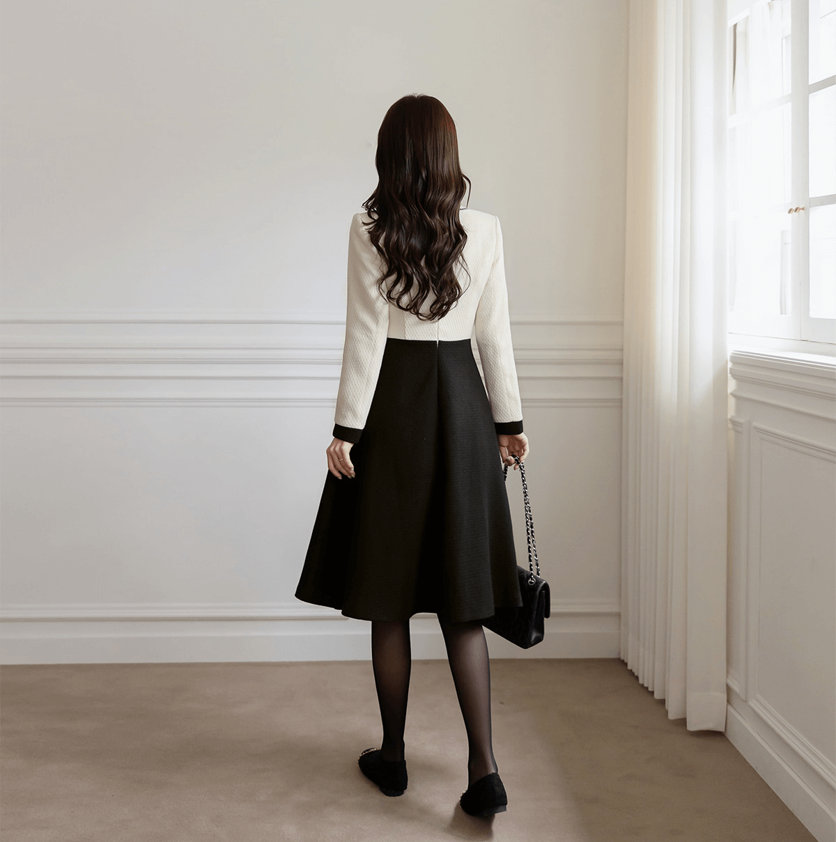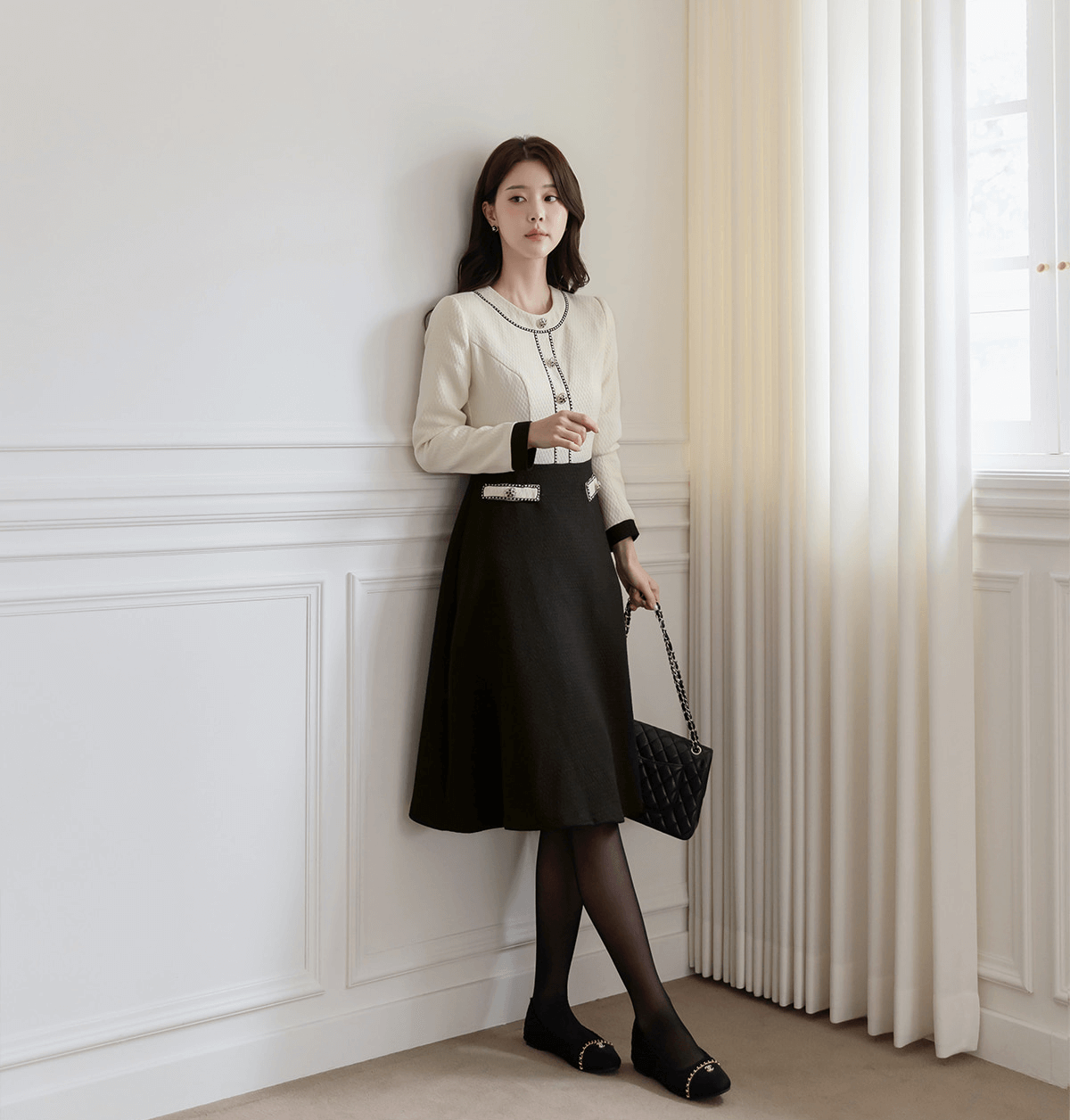 This elegant tweed dress showcases a refined and timeless design, perfect for formal occasions or stylish everyday wear. The round neckline creates a clean and elegant silhouette, while the trimming details add a touch of sophistication. Made from a soft yet structured tweed fabric, it ensures both comfort and style. This versatile piece effortlessly blends classic elegance with contemporary appeal, making it a wardrobe essential.