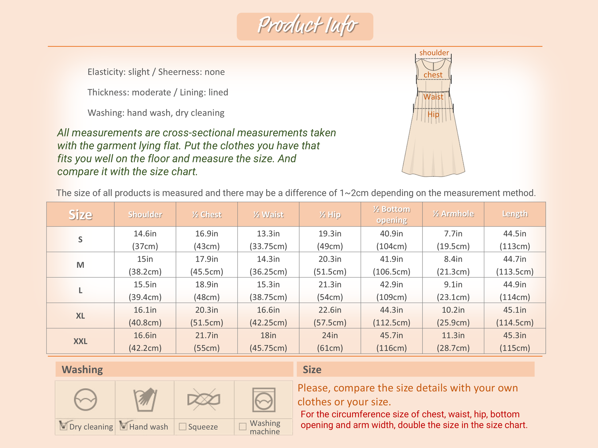 The dimensions in the size chart of the product I'm selling are the actual cross-section size of the clothes. All Measurements are taken with clothes lying flat(For the circumference size, just double the size chart size).