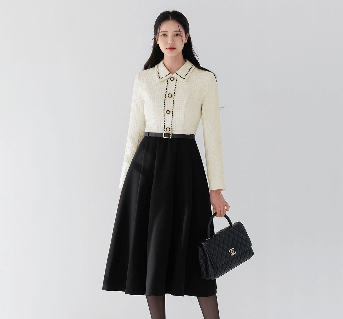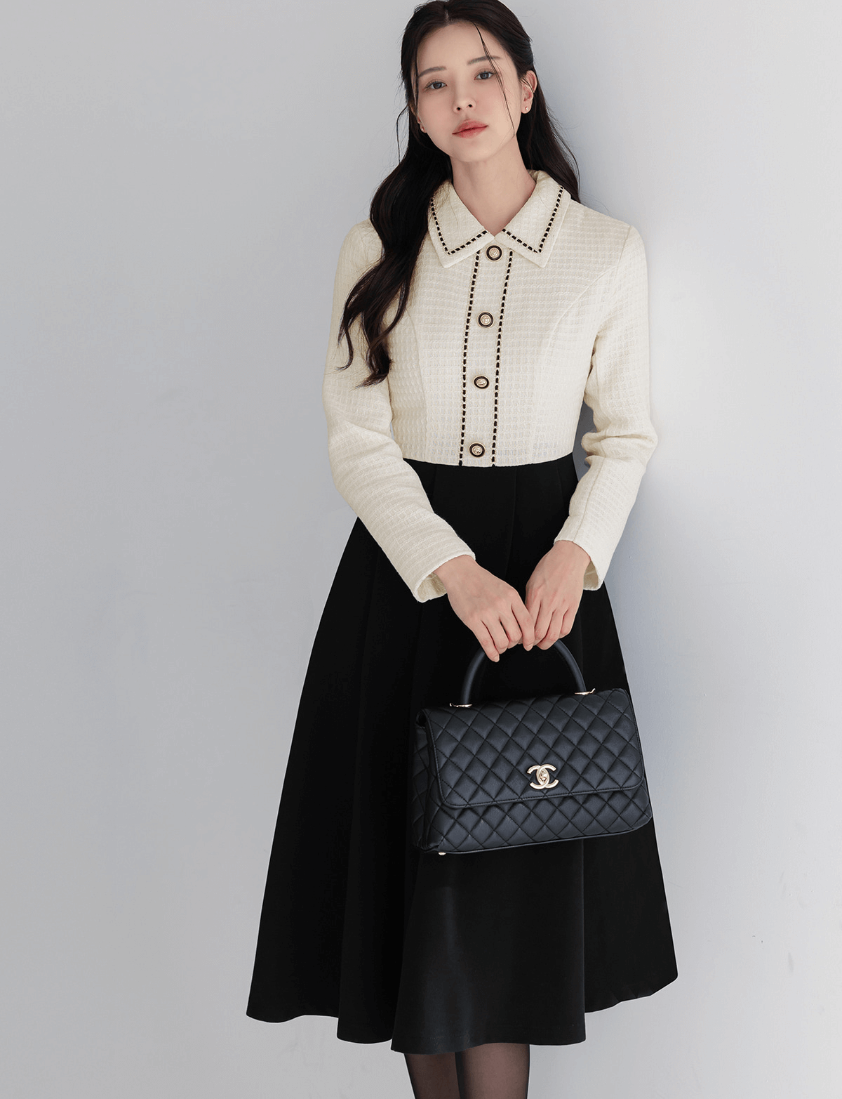 This elegant dress features a clean and graceful design, highlighted by its striking two-tone contrast. The ivory top is adorned with black tweed tape accents along the collar and front, adding a stylish touch to the overall look. The beautiful contrast between the ivory top and the black skirt creates a harmonious and sophisticated aesthetic.
