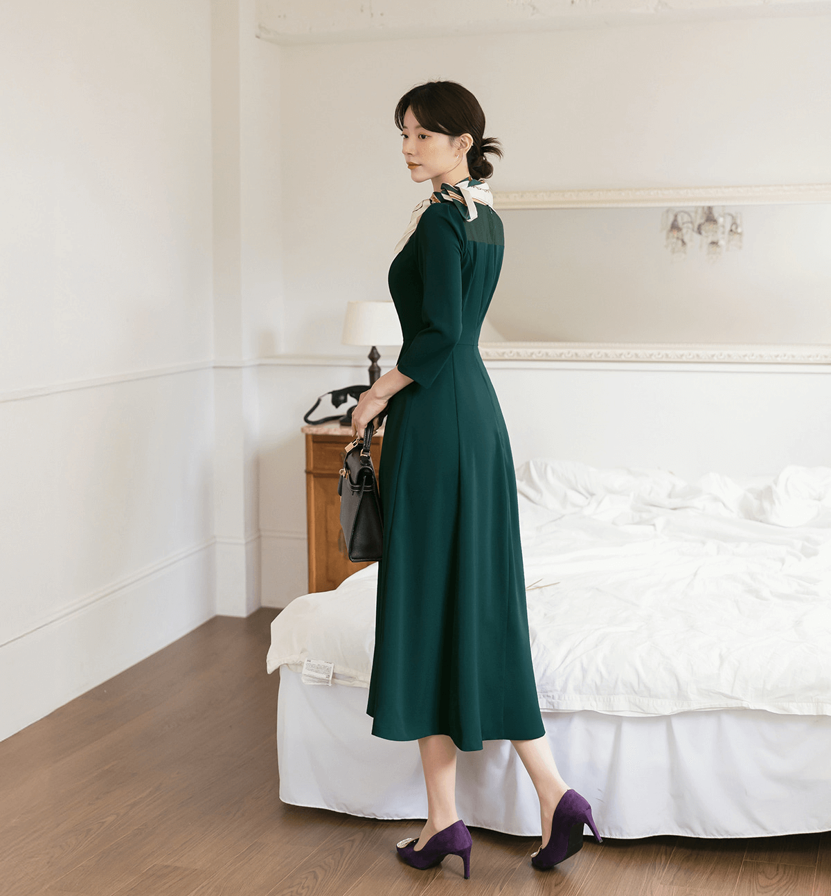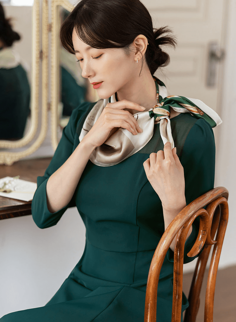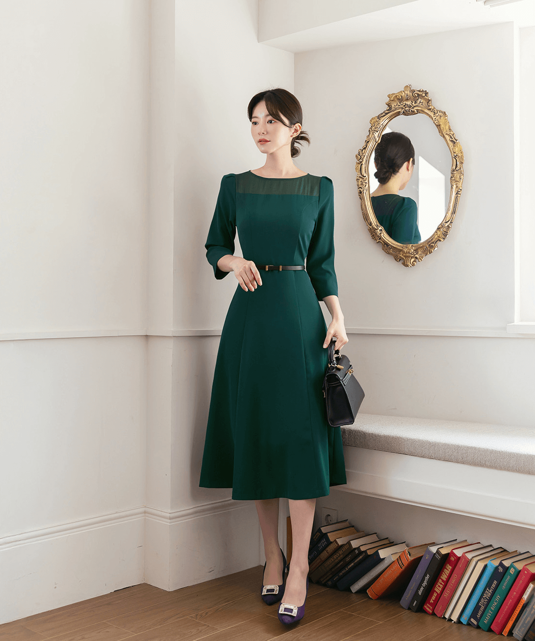 This elegant dress features 3/4 sleeves and a belted design, exuding timeless sophistication with a modern flair. The standout detail is the sheer neckline accent, adding a subtle yet captivating touch to the overall look.