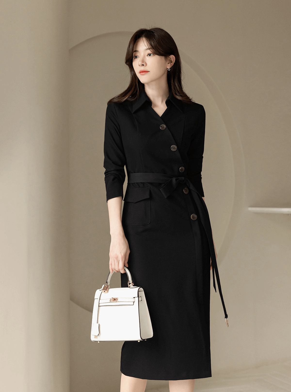 Redefine elegance with this Open-Collar Belted Dress, a perfect blend of classic tailoring and modern design. The open-collar neckline adds a sophisticated touch, while the matching belt cinches the waist for a flattering, feminine silhouette.