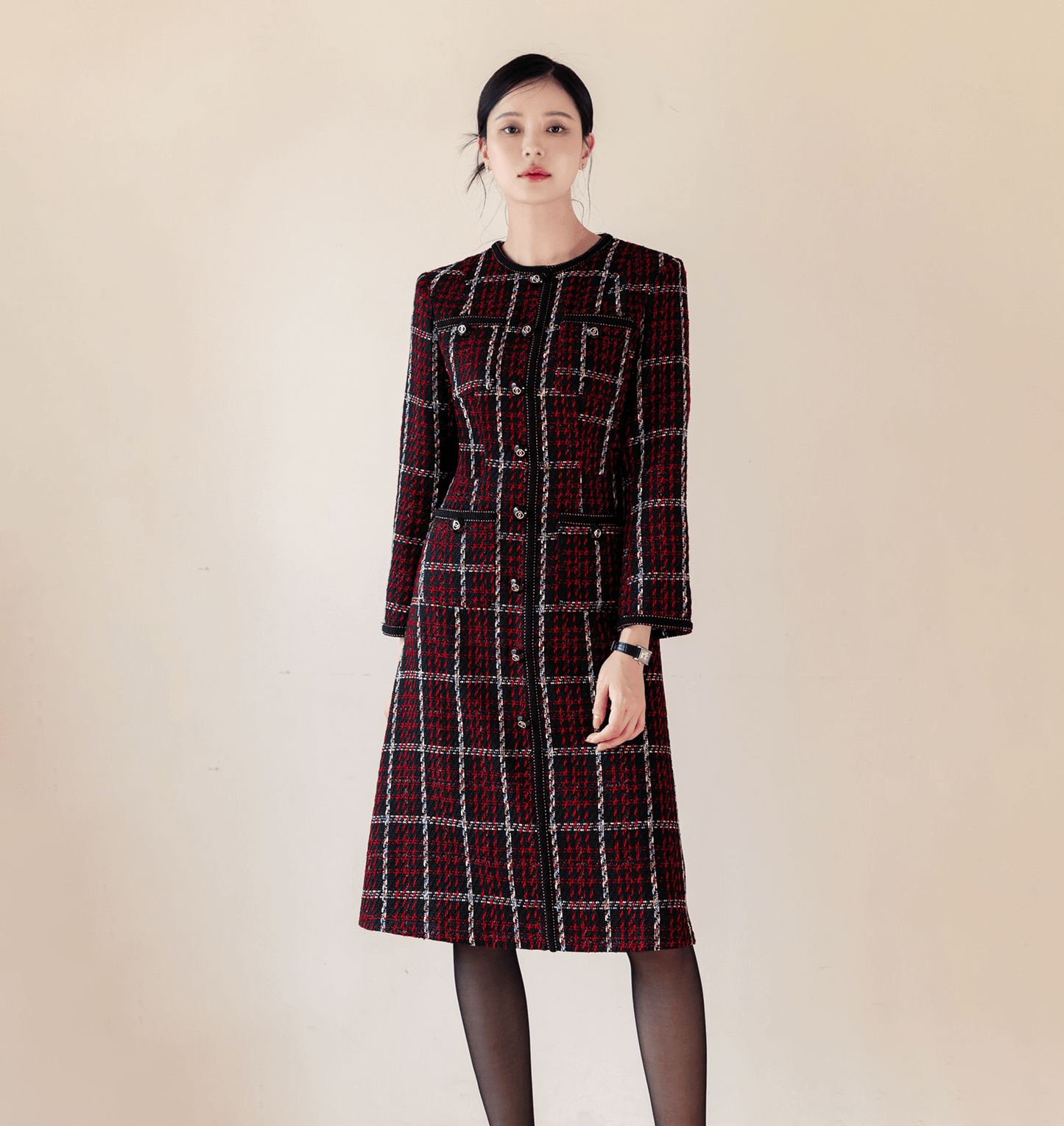 This elegant tweed dress features a sophisticated contrast trim, offering a timeless and refined look.